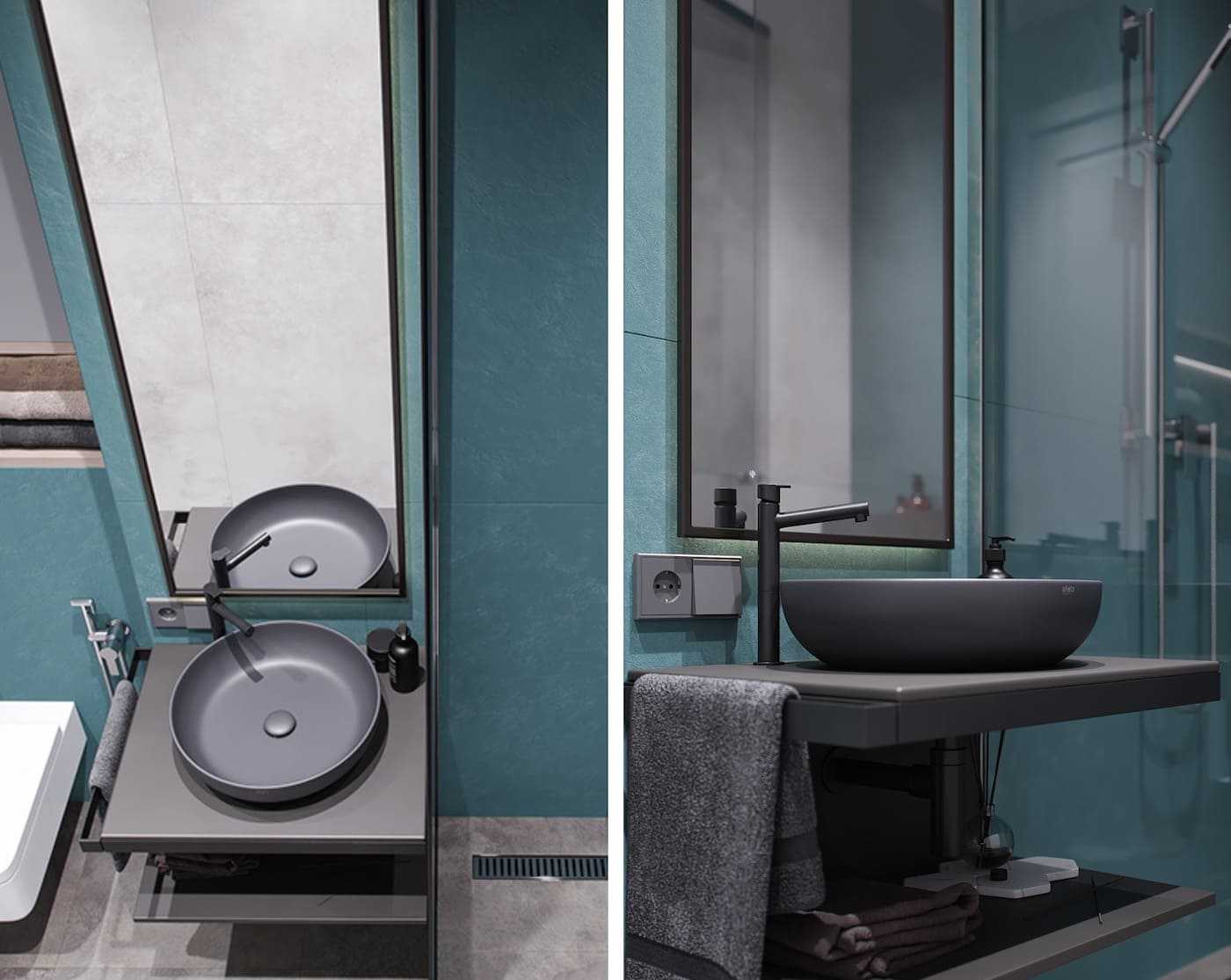 Этот пункт не спроста идёт 2-ым. Раковина встроенная в столешницу + крутой смеситель критично важны и поднимают уровень интерьера ванной на принципиально другой уровень.