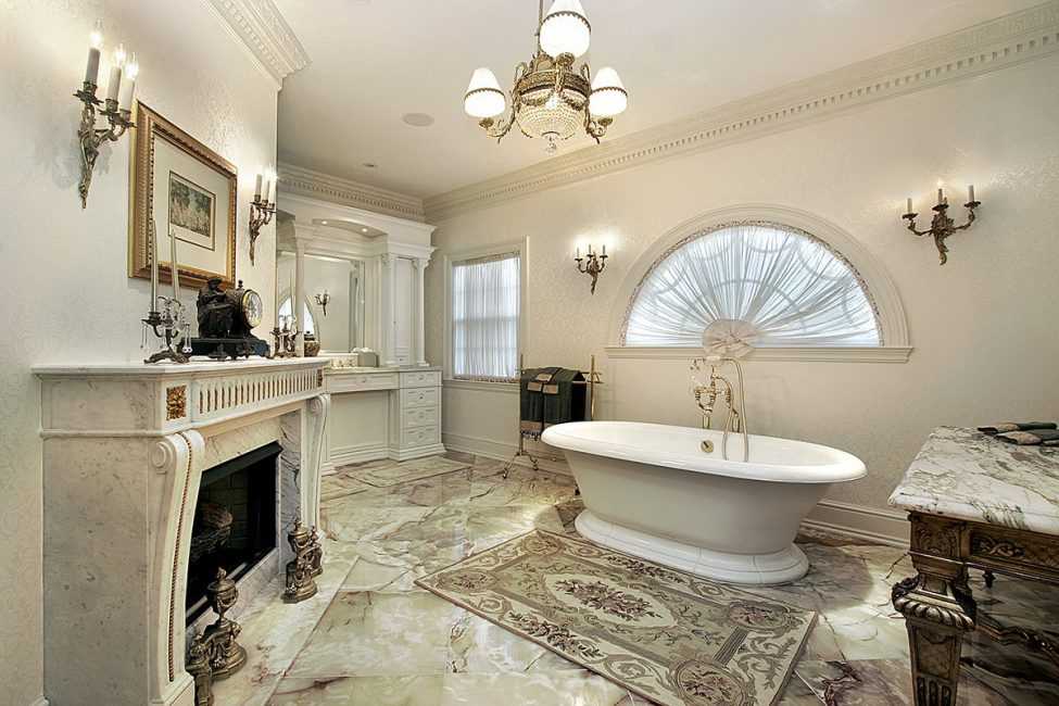 - Ванна. Подойдёт чугунная или акриловая купель на высоких изогнутых ножках с покрытием под бронзу, латунь или никель. В частном доме ванну округлой формы можно установить по центру или на подиуме, превратив чашу в главное украшение обстановки.