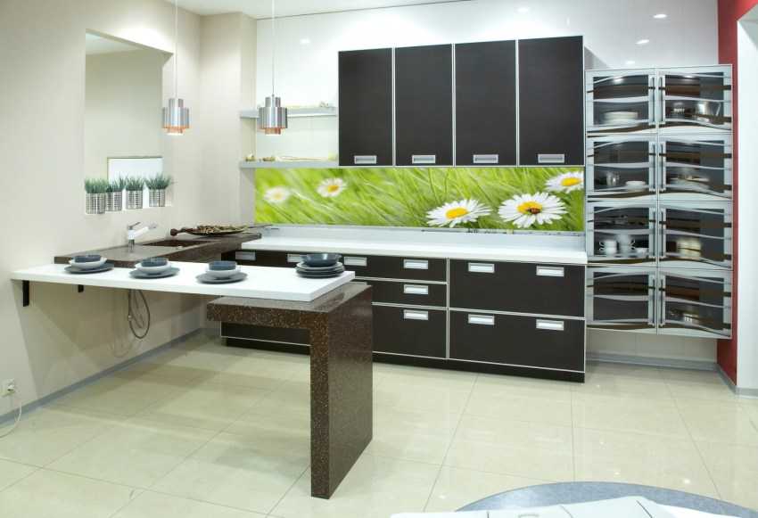 При использовании такого способа оформления рабочей зоны кухни проявляется ряд отличительных от прочих вариантов преимуществ. Они заключаются в: