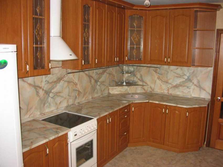 Отличный вариант для тех, кто хочет сделать короткий фартук или фартук необычной формы. Также подходит тем, кто хочет избавиться от плинтуса – панель просто склеивается со столешницей, поэтому можно не бояться, что вода попадет в стыки.