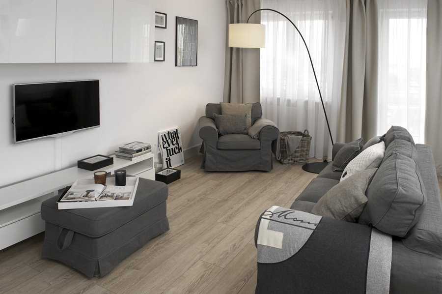 Выбирая серую гостиную , нужно помнить, что выбор правильного оттенка серого имеет первостепенное значение. Этому решению должен предшествовать разбор помещения. Маленькая гостиная и серый цвет в слишком темном оттенке могут создать эффект мрачной комнаты и оптически уменьшить ее. В этом случае нужно получить хорошее искусственное освещение. Дополнительно сочетайте серые со светлой основой — белая стена и серый отлично смотрятся вместе, а квартира оптически увеличивается.