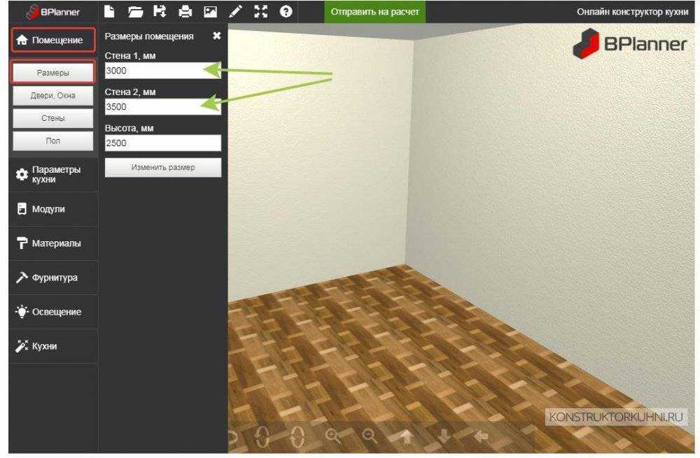 1. Указать размеры кухни