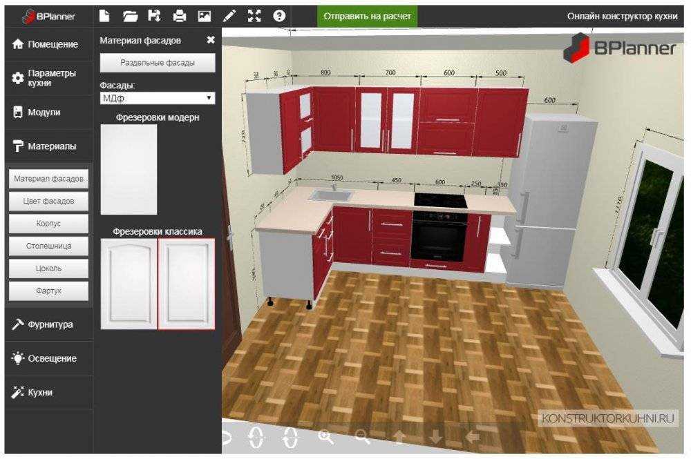 После того, как вы нарисовали кухню, вы можете узнать ее цену в мебельных фирмах. Для этого наджмите на кнопку “Отправить на расчет”. После этого с вами свяжется менеджер. Актуально для Москвы и Санкт-Петербурга.