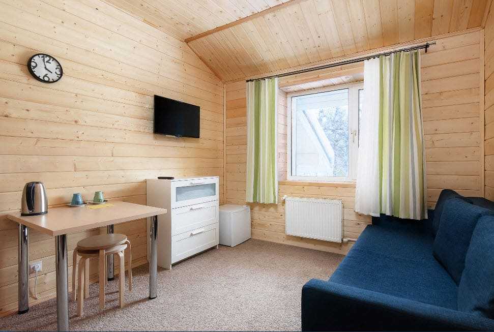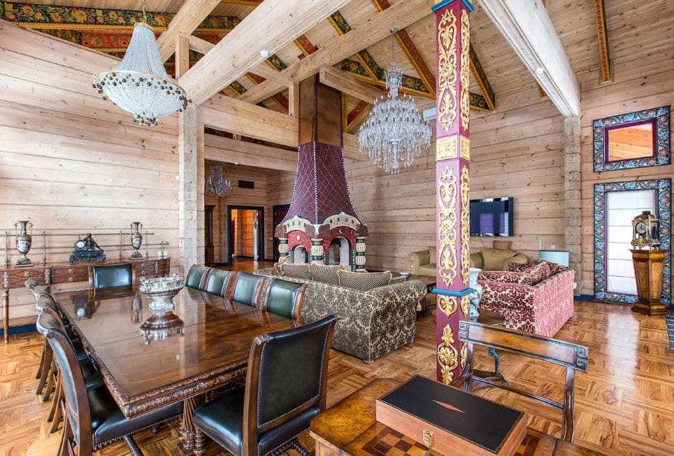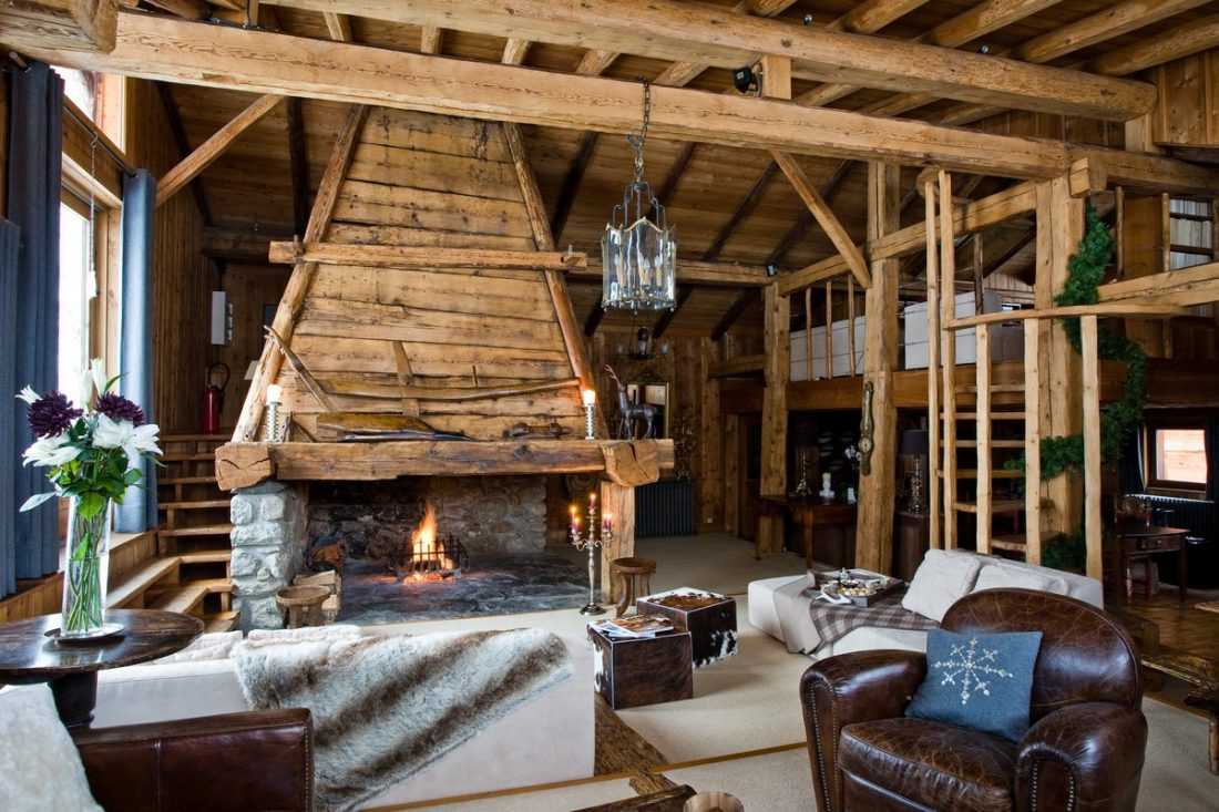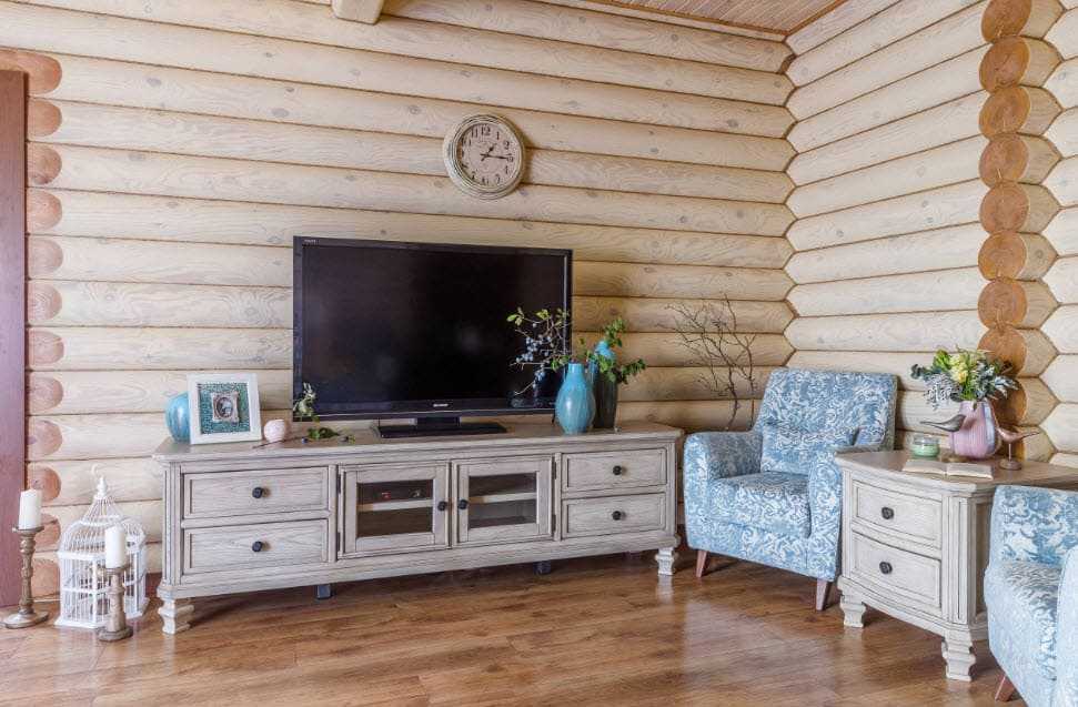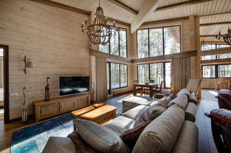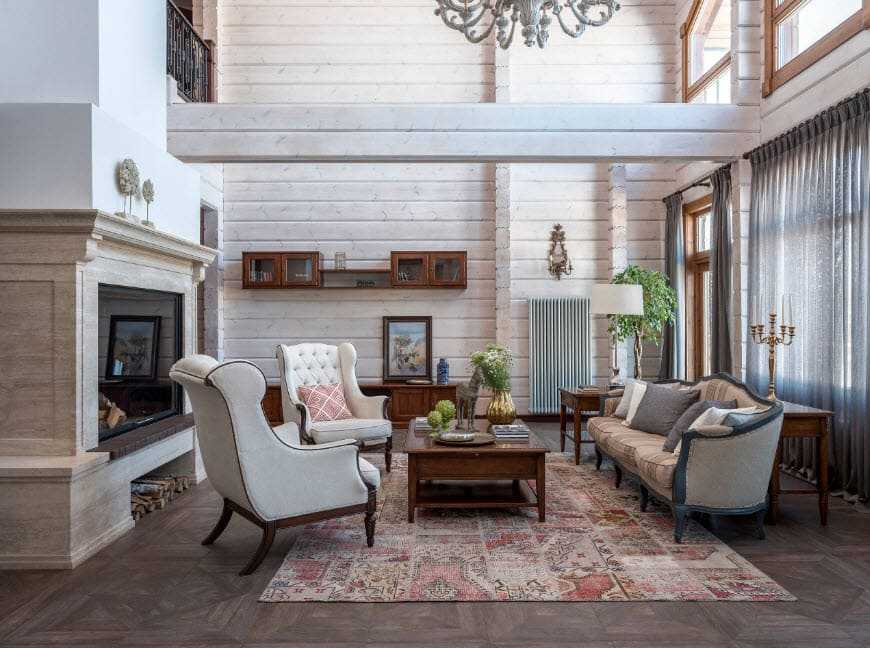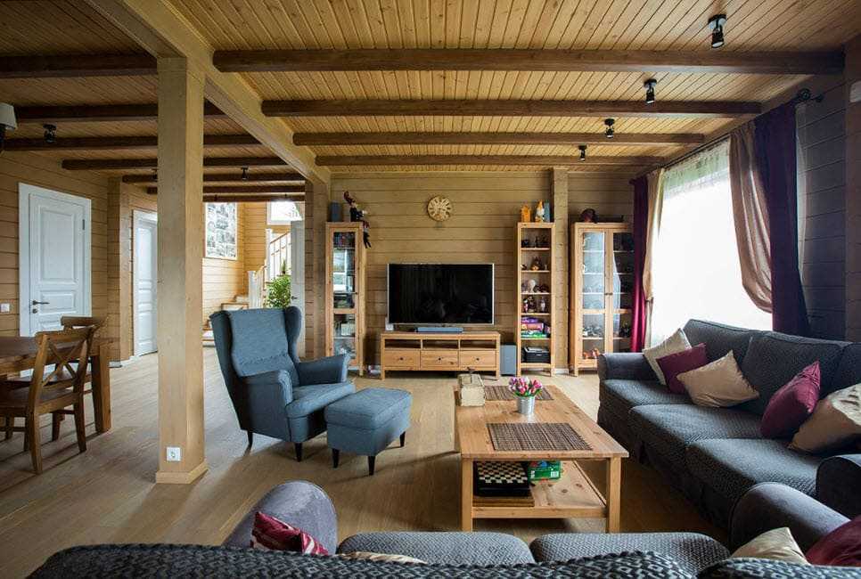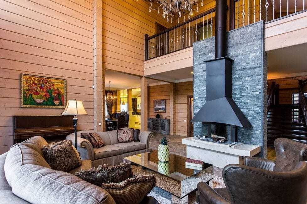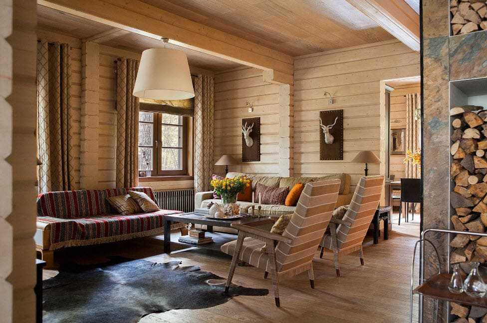 В интерьере гостиной главным центральным элементом обстановки может стать камин, декорированный с помощью чугунной решетки, трубы или облицованный каменной кладкой и жаростойкой плиткой. Первозданный вид стен, покрывают при помощи лака или краски в светлых тонах, для сохранения естественной древесной фактуры.
