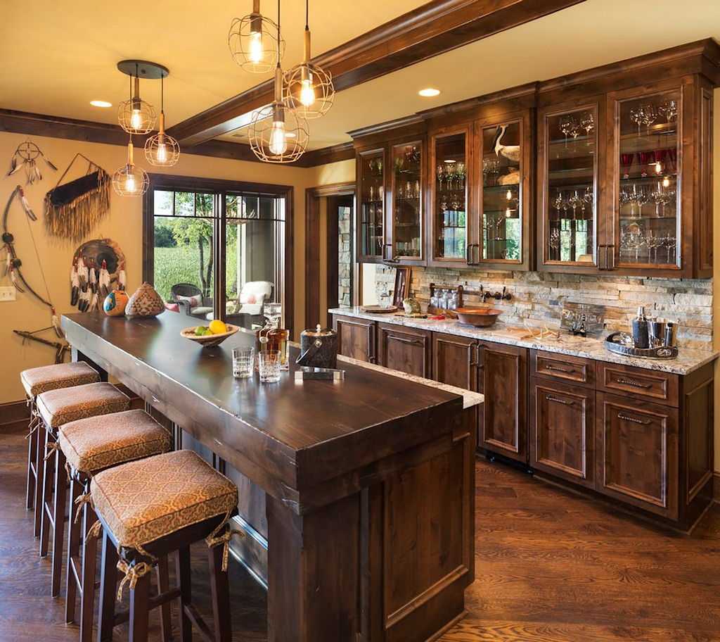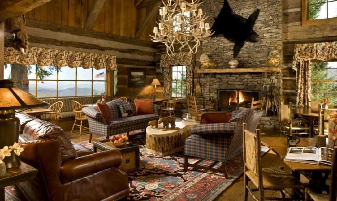 Цветовая палитра включает в себя в основном коричневые, травяные, бордовые оттенки. Непременными атрибутами стилизации стали камин, обложенный камнем или дубовыми бревнами, а также несколько внушительного размера пейзажей, чучела и оружие, развешенные на стенах.