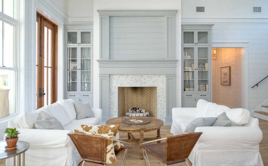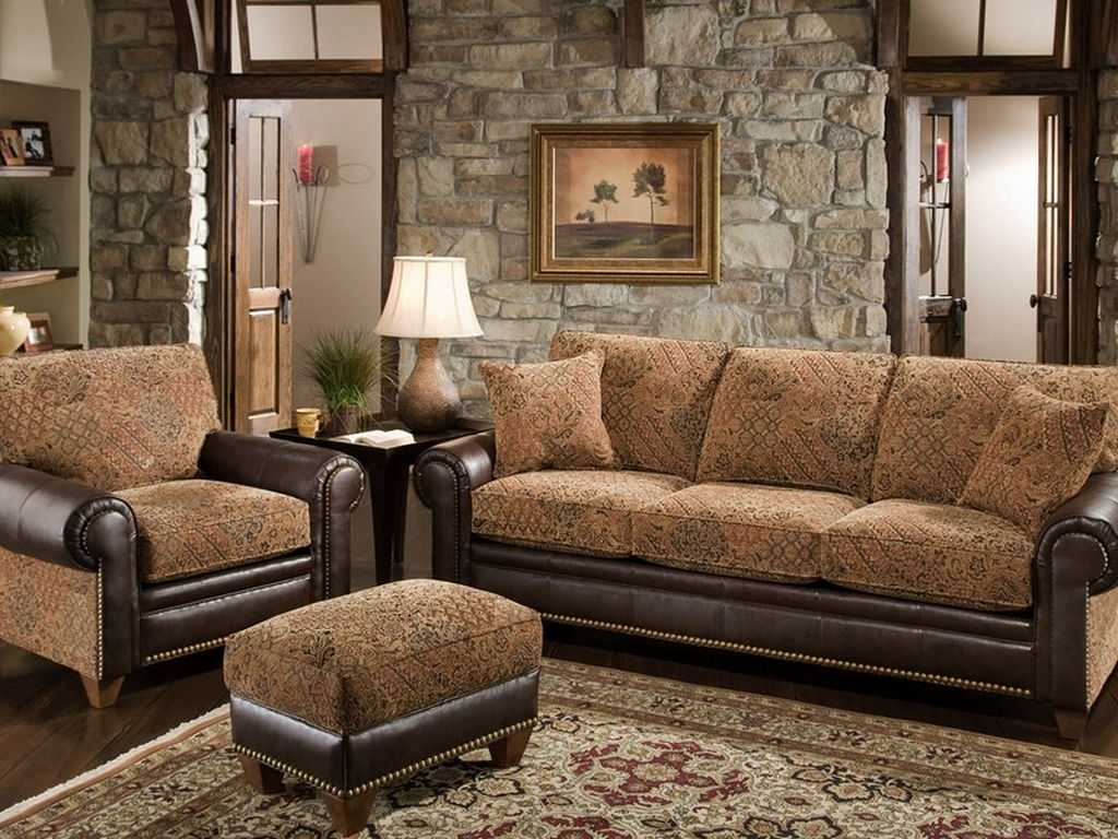 Гостиная этого направления – место для встреч с друзьями и вечерних посиделок. Расслабиться и погрузиться в атмосферу теплого общения поможет светлая отделка кремово-бежевого спектра. Комбинируйте дерево и камень с другими материалами, главное – не переборщить. Деревянный пол – ламинат, паркет или доска. Мебель добротная, прочная, с налетом старины. Не забывайте про декор, дабы оживить пространство – подушки, вазы, цветы, картины. Камин станет центром притяжения в комнате, создавая неповторимый уют и распространяя тепло.