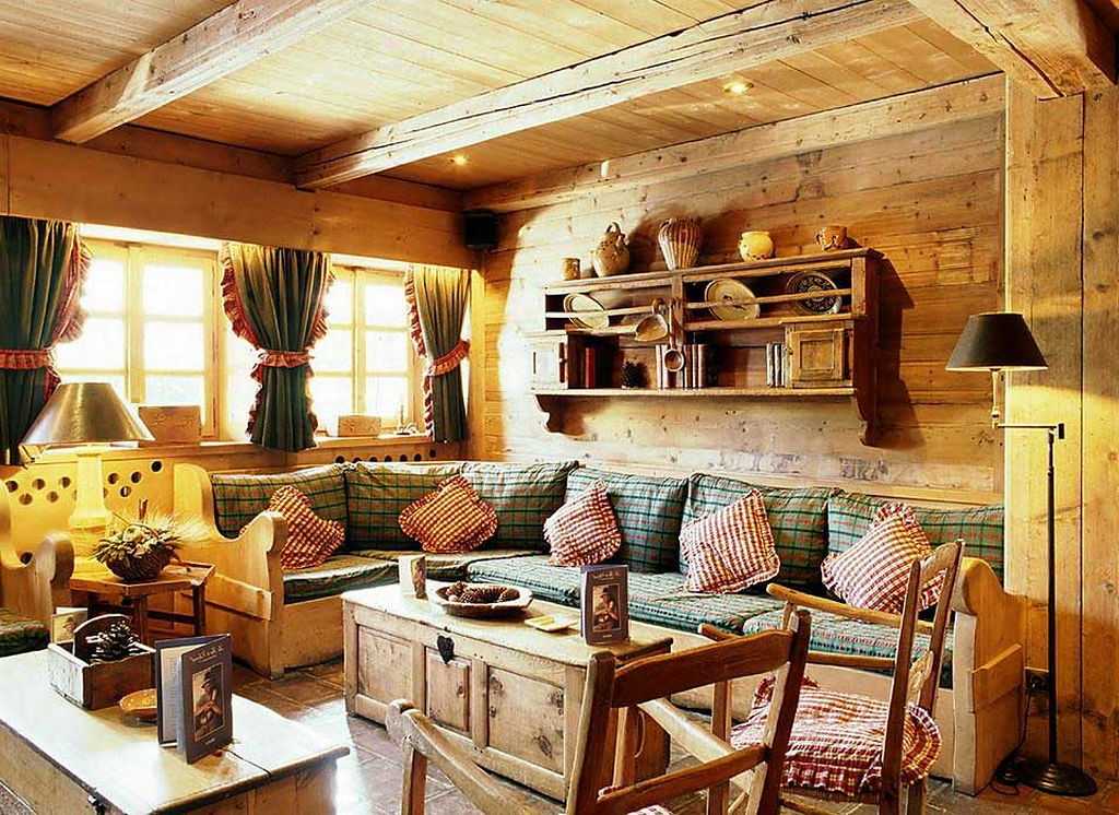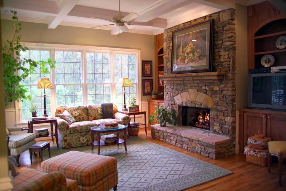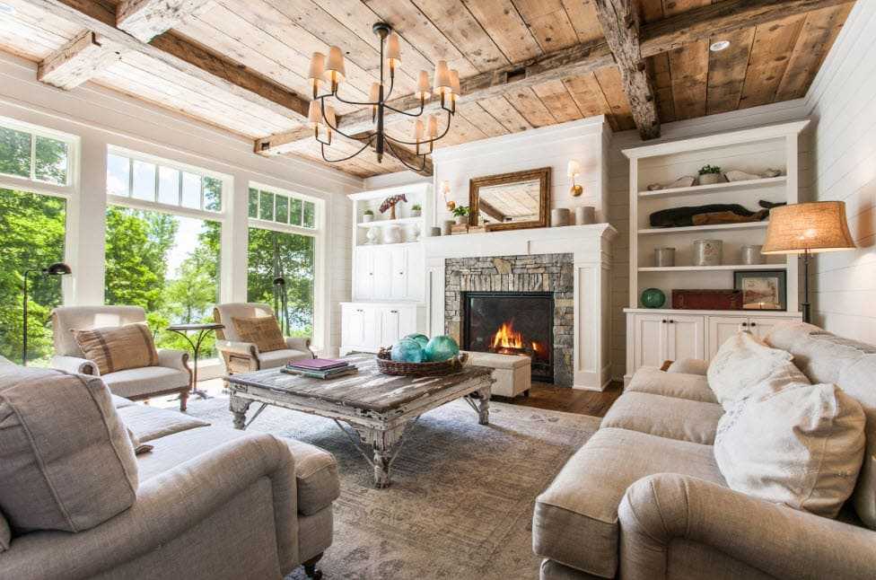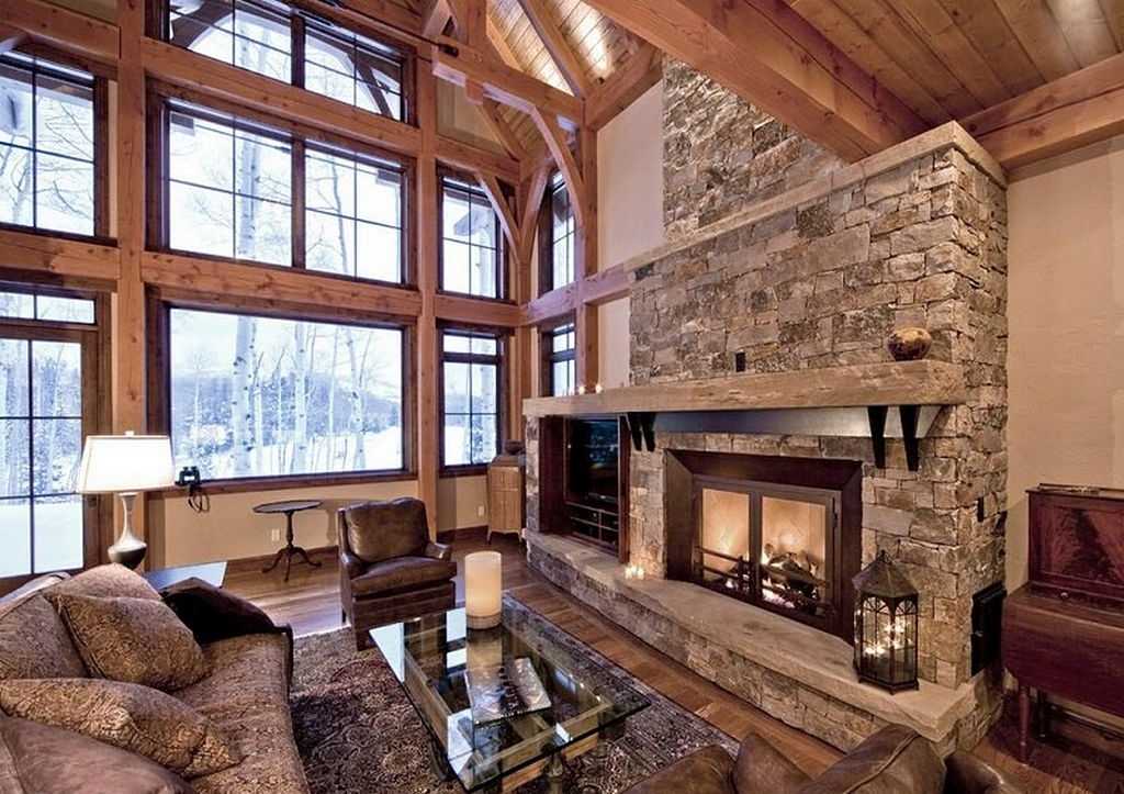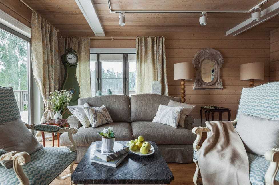 Контрастное сочетание с деревом создает каменная кладка, которой оформляют тв-зону или место возле камина. При наличии высокого потолка, его декорируют балками темного цвета. В гостиной с низким потолком применяют деревянные панели или краску в пастельных оттенках. Комнату желательно не загромождать мебельными предметами. Достаточно установки дивана, кресел и журнального столика.