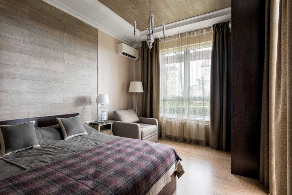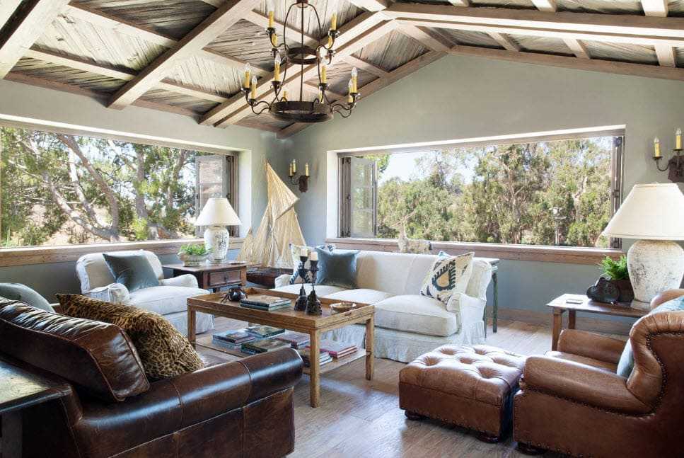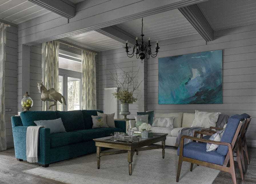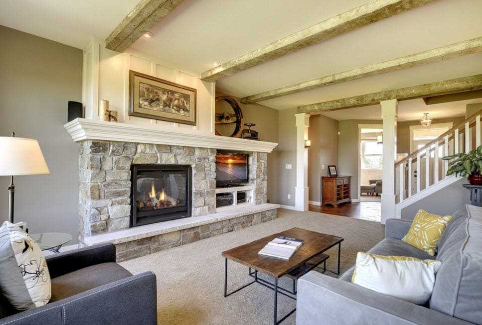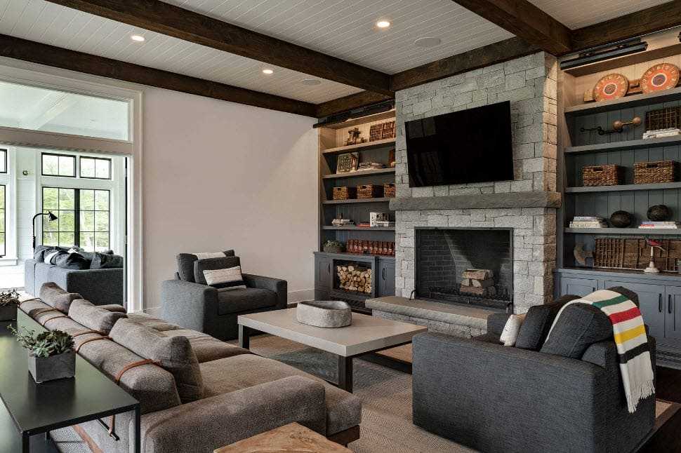 Контрастное сочетание с деревом создает каменная кладка, которой оформляют тв-зону или место возле камина. При наличии высокого потолка, его декорируют балками темного цвета. В гостиной с низким потолком применяют деревянные панели или краску в пастельных оттенках. Комнату желательно не загромождать мебельными предметами. Достаточно установки дивана, кресел и журнального столика.