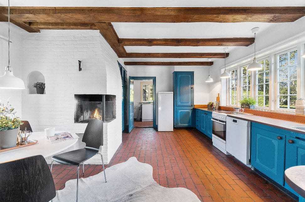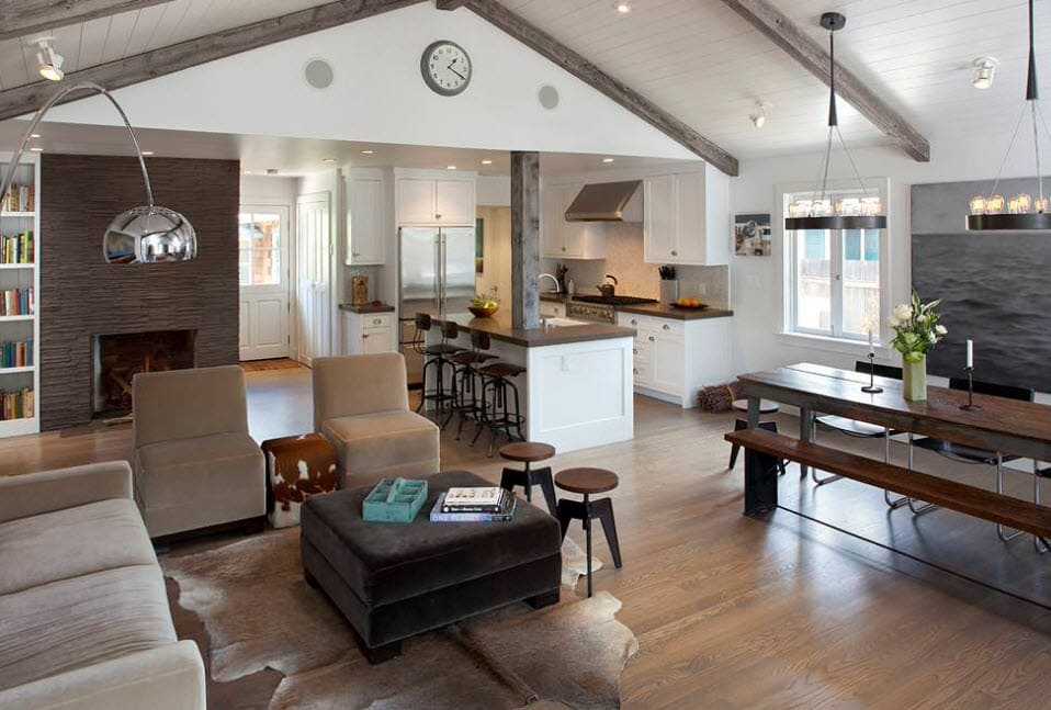 Полы из дерева в кухонной комнате уместны также отлично, как и в зоне для приема гостей, можно применять ковер и добавить цвет и уют дома.