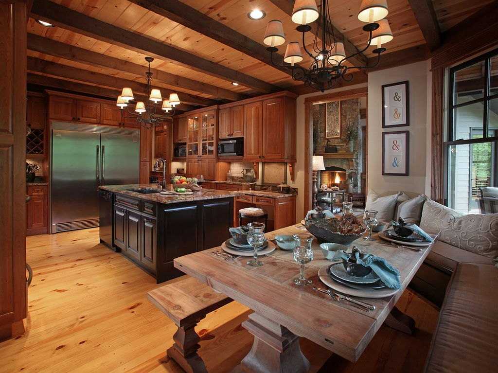 На фото современный дизайн кухни в бревенчатом доме.