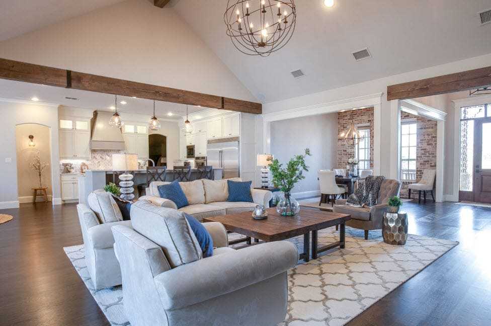 Крупногабаритная мебель, такая как диваны из кожи для гостиной комнаты в стиле кантри, — еще 1 способ сделать стиль. Вы можете подобрать узорные подушки из тартана, которые придают чувство деревенской местности. Если вы строите свой дом в кантри, то окна больших размеров и балки из дерева или вероятность увидеть кладку из кирпича строения, также будут отличной идеей.