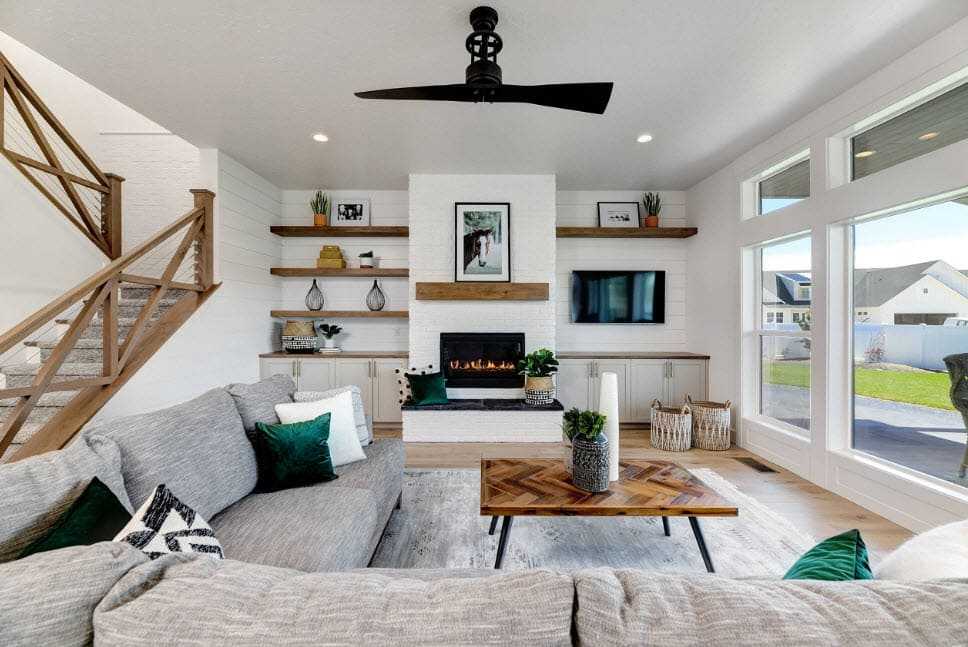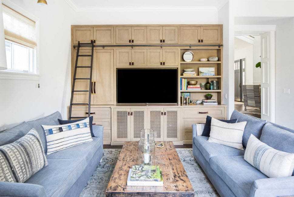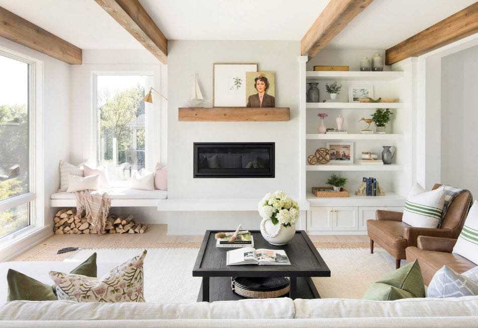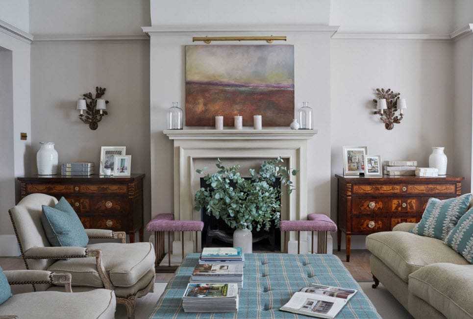 Комната для сбора семьи и гостей — эпицентр уюта. Главным акцентом в доме может быть камин, в квартире — непременно большой и комфортный диван с большим количеством подушек. Чтобы последний притягивал на себя как можно больше внимания, выбирайте модели с узором — цветочным или геометрическим, в зависимости от направления стиля.