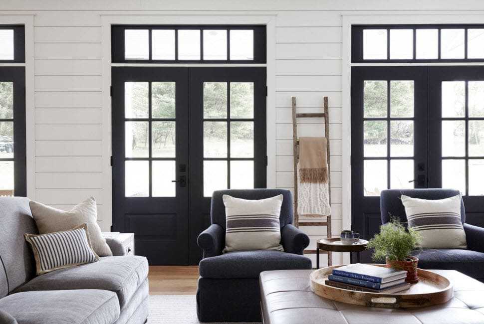Дома в деревенском стиле могут хорошо выглядеть с большим спектром различных цветов, так как это на самом деле создаёт чувство семейного комфорта. Мягкие серые оттенки или зелень могут принести чувство фермы, стены белого цвета с добавкой плинтуса и выделения рамы для двери как правило создают сложный эффект.