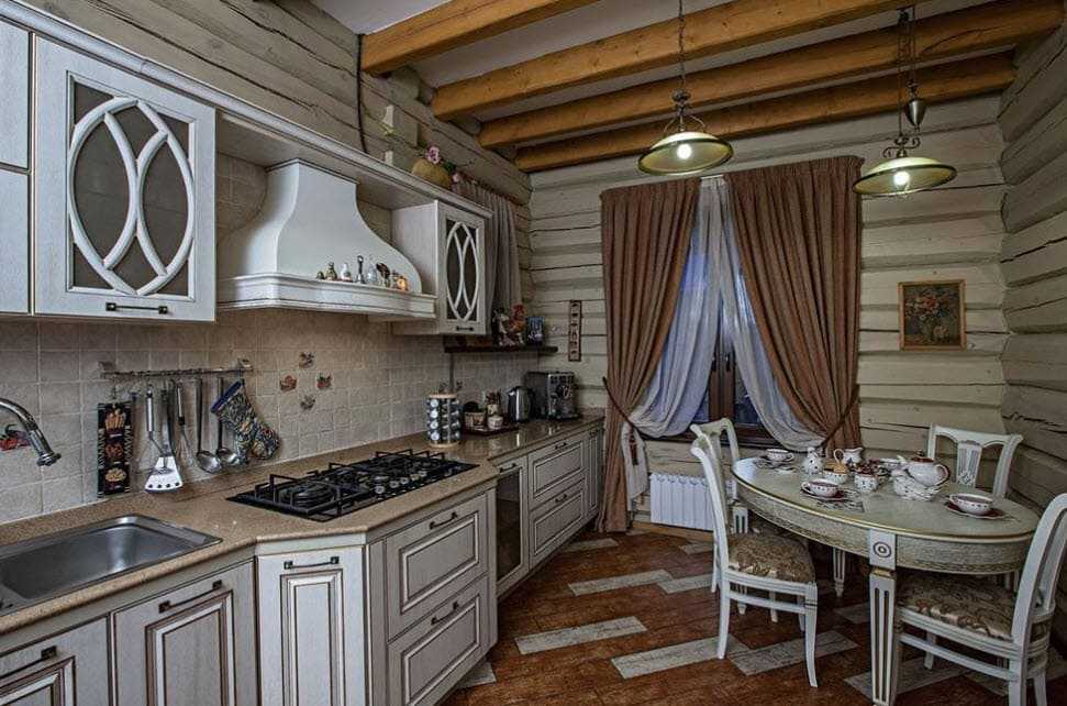 На кухне в основном оставляют натуральное бревенчатое исполнение стен. Иногда в зависимости от стилевого решения в качестве отделки применяют штукатурку или покраску. Фартук выкладывают керамикой, например, выполненной под пэчворк.