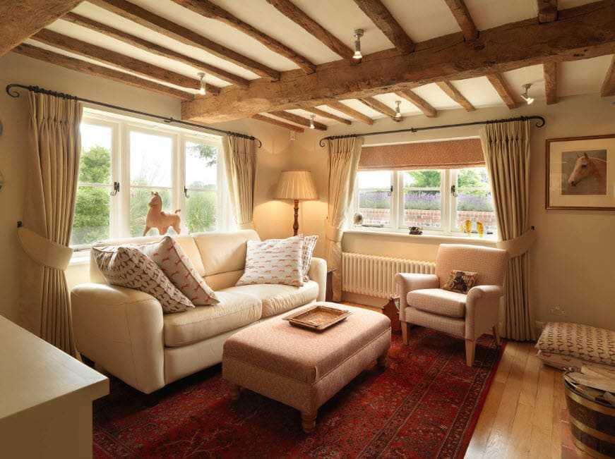 Отсутствие вычурной роскоши и богатства позволяет создать уютный коттедж с мягкой, домашней обстановкой. Подчеркивают простоту интерьера нейтральные оттенки – белый, бежевый, пастельные цвета наиболее часто используются в этом стиле. Мебель окрашивают в гармонирующие, неяркие цвета. Открытые балки являются основными элементами стиля. Их не принято выделять цветом в общем интерьере.