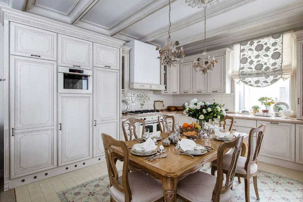 Элементы, имитирующие состаренное золото и серебро, изящные подсвечники, великолепная люстра могут стать акцентами стилизованного интерьера. Романтичный внешний вид создают изогнутость форм, легкость конструкций, старинная резьба, несколько слоев краски, декупаж.