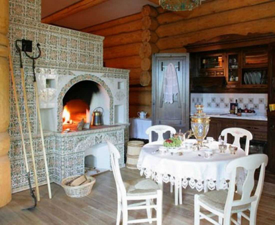 Русские шкафчики и полочки, платяной шкаф, стол на «лыжах», треугольный буфет «поставец», сундуки и другие предметы, по виду напоминающие старинную русскую мебель, помогают создать искомый образ в интерьере. Печь традиционно украшается узорной керамической плиткой — изразцами. Обычно той же плиткой выкладывается и «фартук» кухни.