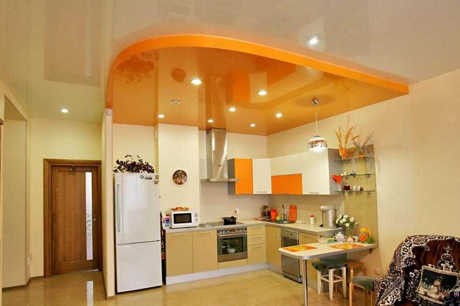 С помощью натяжных потолков также можно скрыть на кухне неровности углов и коммуникации.