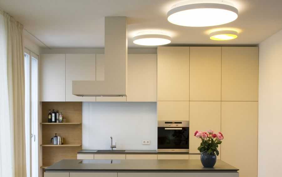 Простые подвесные потолки — это наиболее часто используемые; из-за того, что он универсален, он подходит для кухни в разных стилях; простой подвесной потолок можно комбинировать с дискретными точечными галогенами, например, круглой формы; галогенные лампы на кухне лучше всего пускать в потолок;
