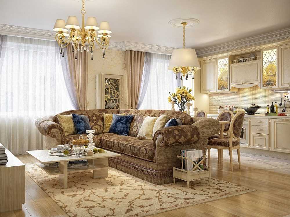 Данный стиль идеально подходит для помещений с большой площадью. Именно в просторных кухнях-гостиных получится в полной мере реализовать все возможности классического направления. Такие комнаты позволяют использовать в качестве элементов декора массивный гарнитур, плотные шторы в пол с комбинированными ламбрекенами сложной формы, круглый обеденный стол, кресла, мягкие уголки. Для большего уюта следует разбить помещение на рабочую, обеденную и зону отдыха. Сделать это можно с помощью продуманной системы освещения и комбинированного напольного покрытия. Пол рабочей зоны может быть отделан плиткой, а остальная часть комнаты – паркетом, качественным ламинатом или плитами другой расцветки и фактуры.