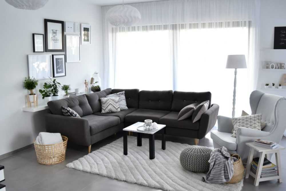 | С белым цветом | Оптимальное и достаточно интересное решение. Дизайн комнаты получается уютным и спокойным. | 1. Главное – цветовой баланс. Белый и серый не должны использоваться в равных пропорциях. Например, серый диван может стать связующим звеном белого и черного цвета.