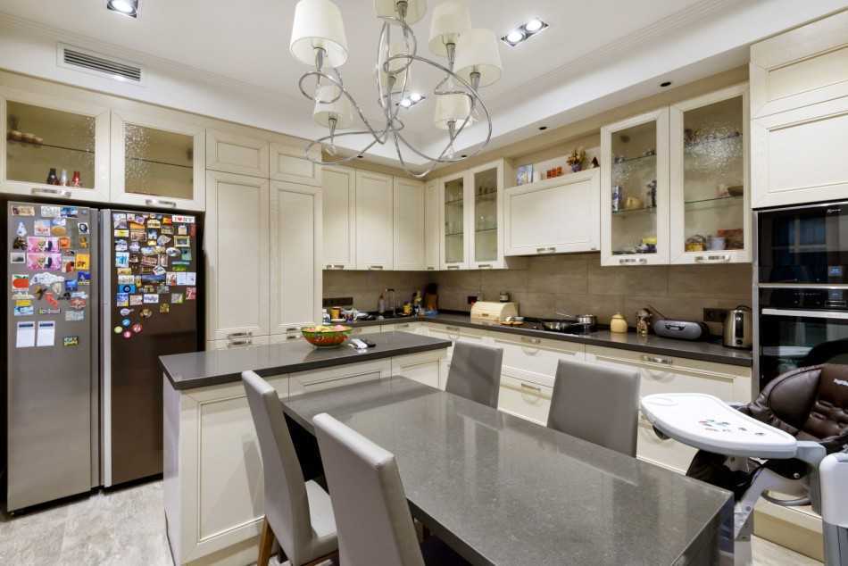 Специалисты рекомендуют приобрести сразу два средних холодильника, чтобы готовить еду могли несколько человек одновременно. Также это позволить разделить готовые продукты с сырыми. А чтобы зонировать пространство, можно использовать декоративный ковер для обеденной зоны.