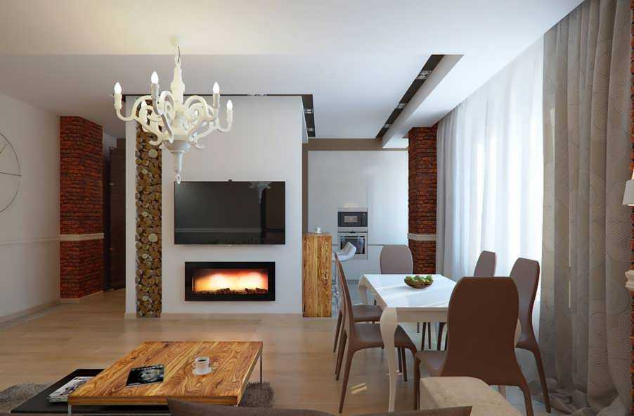 - Если нет желания организовывать перегородки и ниши, можно установить настенный камин. Он крепится на специальных монтажных кронштейнах, продаётся с готовым декоративным обрамлением, и не создаёт сложностей при установке. Такое расположение камина в гостиной совмещённой с кухней не только сделает пространство уютным, но и позволит сэкономить место.