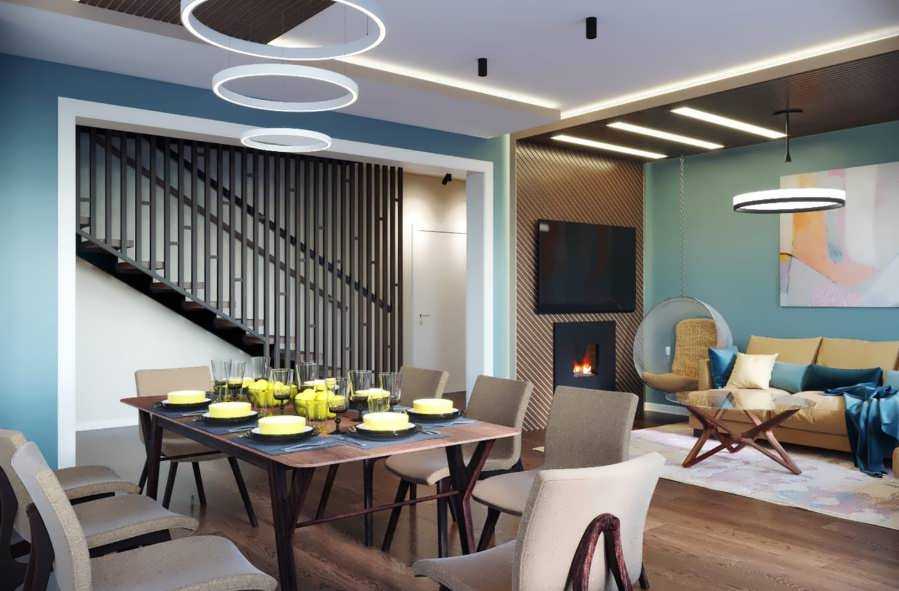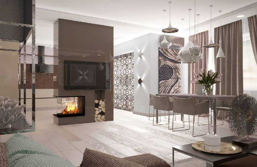 Комната, которая сочетает в себе гостиную и кухню или столовую – идеальное место для установки камина с живым пламенем. Многие дополнительно оборудуют место для барбекю, что очень удобно в холодное время года. Но если такая конструкция недопустима в вашем доме, то присмотритесь к камину с имитацией живого пламени. Они идеально смотрится в дизайне в стиле минимализм.