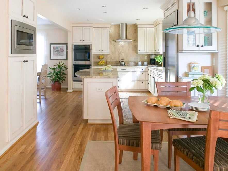 В этом случае кухонный остров является элементом зонирования, а также дополнительной рабочей поверхностью. Обеденная зона выносится за пределы кухни. Визуально ее можно отделить с помощью разных напольных материалов. Также для этих целей подойдет ковер.
