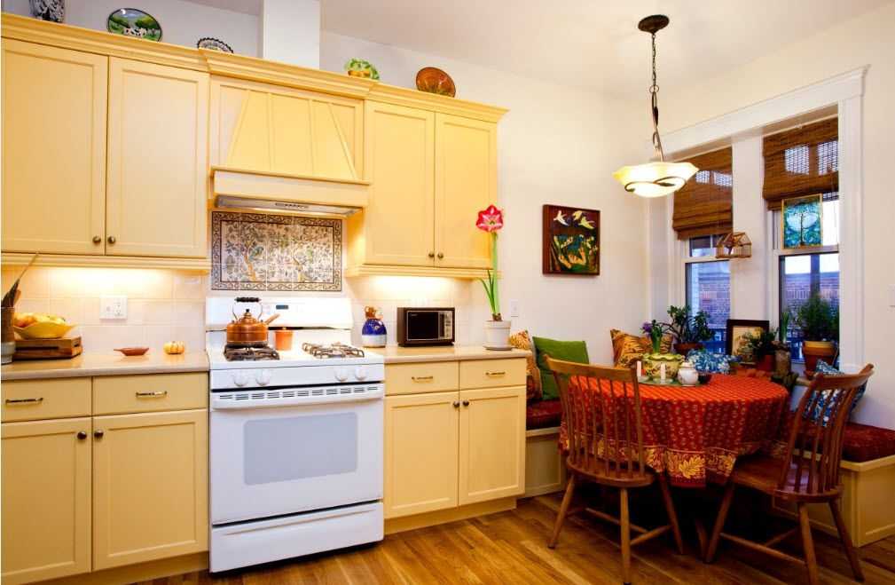 Этот стиль еще называется деревенским, так как в нем применяется немного грубая деревянная мебель, натуральные материалы (дерево, мрамор, камень), глиняная посуда, льняные шторы. Данный стиль гармонично впишется в небольшое кухонное пространство и сделает помещение красивым, функциональным и уютным.