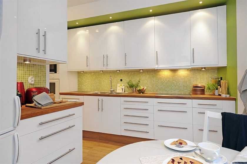 Чтобы кухня выглядела свежо и тепло, комбинировать белый глянцевый кухонный гарнитур с зелеными и желтыми тонами. Такое сочетание используется в прованском или минималистическом стиле.