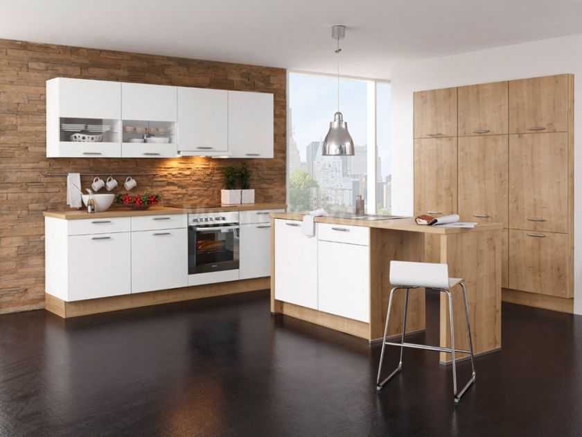 Если столешница будет деревянной, а глянцевые фасады белыми, такие кухни весьма практичные. На них меньше будут видны следы от приготовления пищи. На деревянных поверхностях сложно рассмотреть загрязнения или следы от пальцев. Это хороший вариант для компактных помещений.