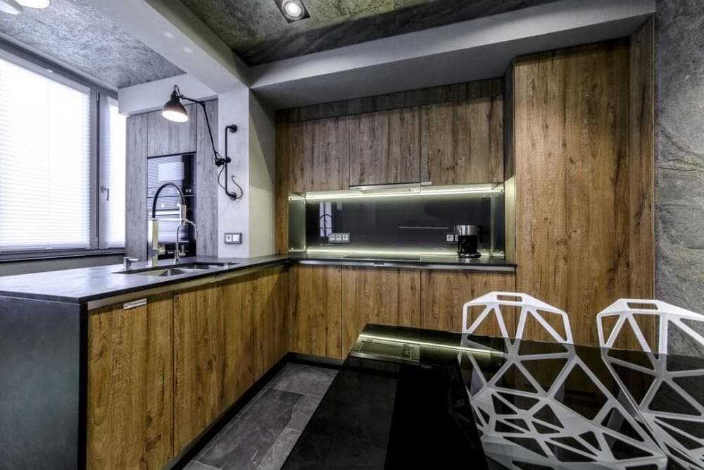 Кухня в маленькой студии, часто размещается на лоджии. Для этого туда «протягиваются» все необходимые коммуникации, приобретается миниатюрный гарнитур. Освободившееся кухонное пространство становится гостевым, спальным. Когда на лоджию вынесена вся рабочая зона, на месте оконного проема, а также перпендикулярно ему, монтируют барную стойку, в том числе Г-образную.