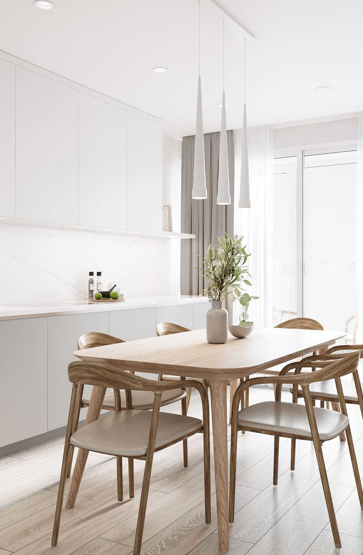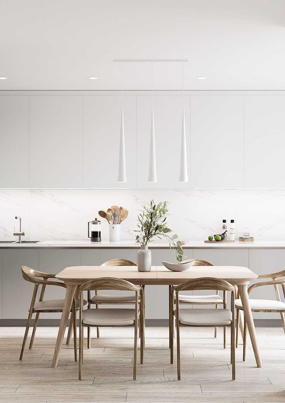 В интерьере белой кухни 2022 будут отлично смотреться стол со стульями из массива дерева или цветного стекла.