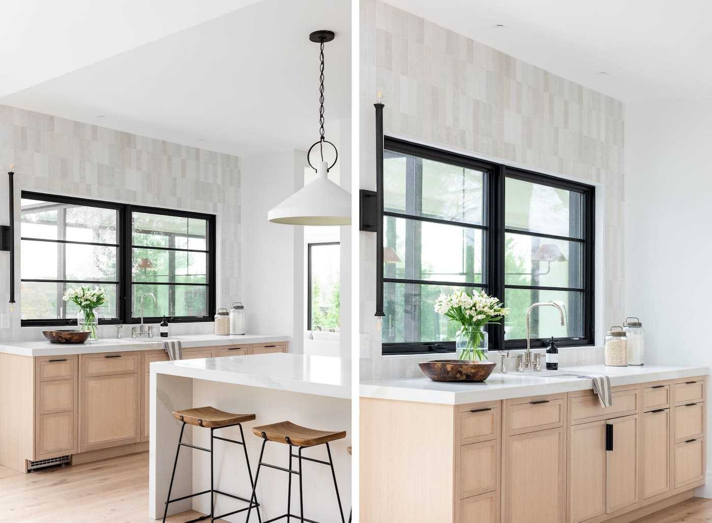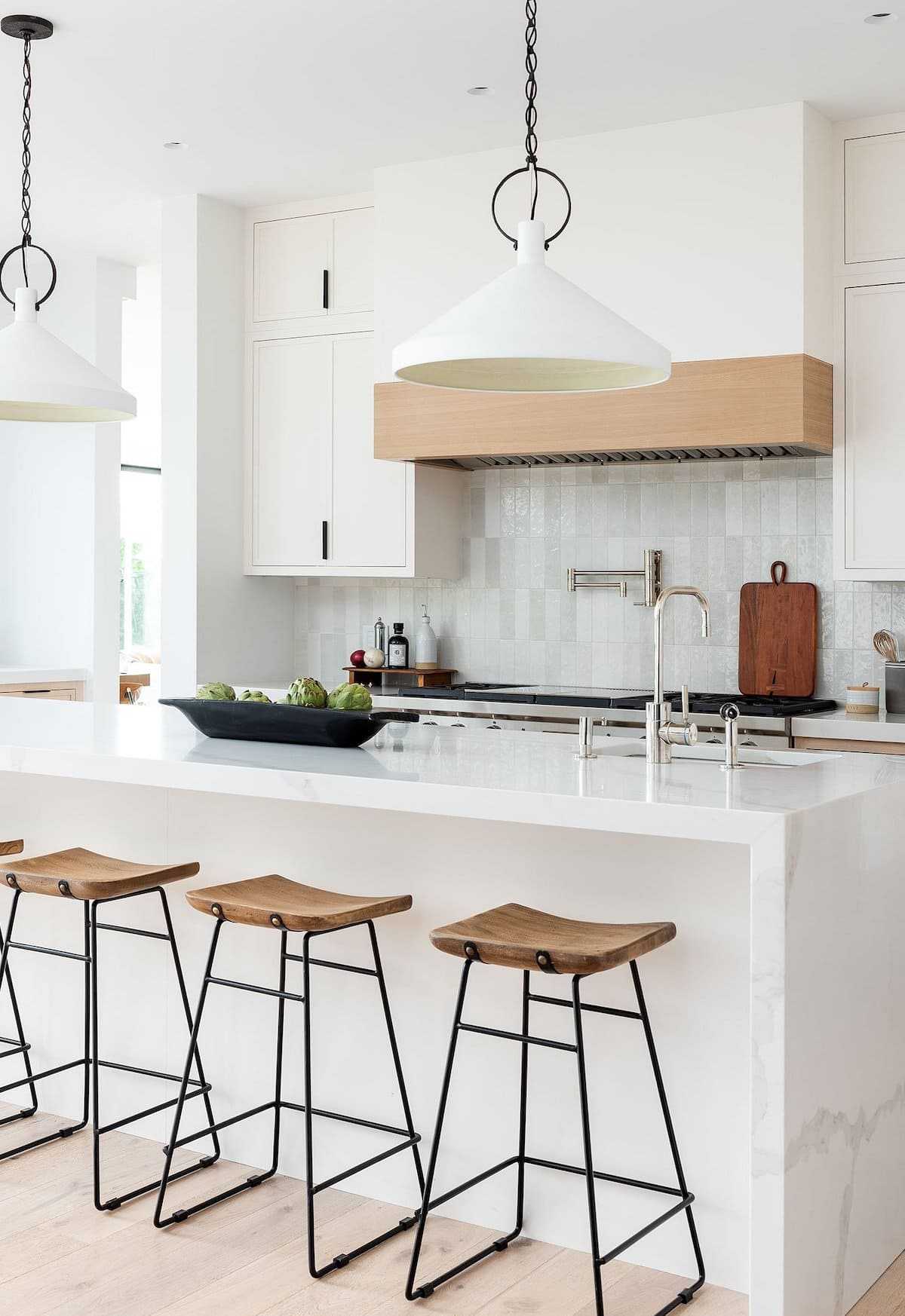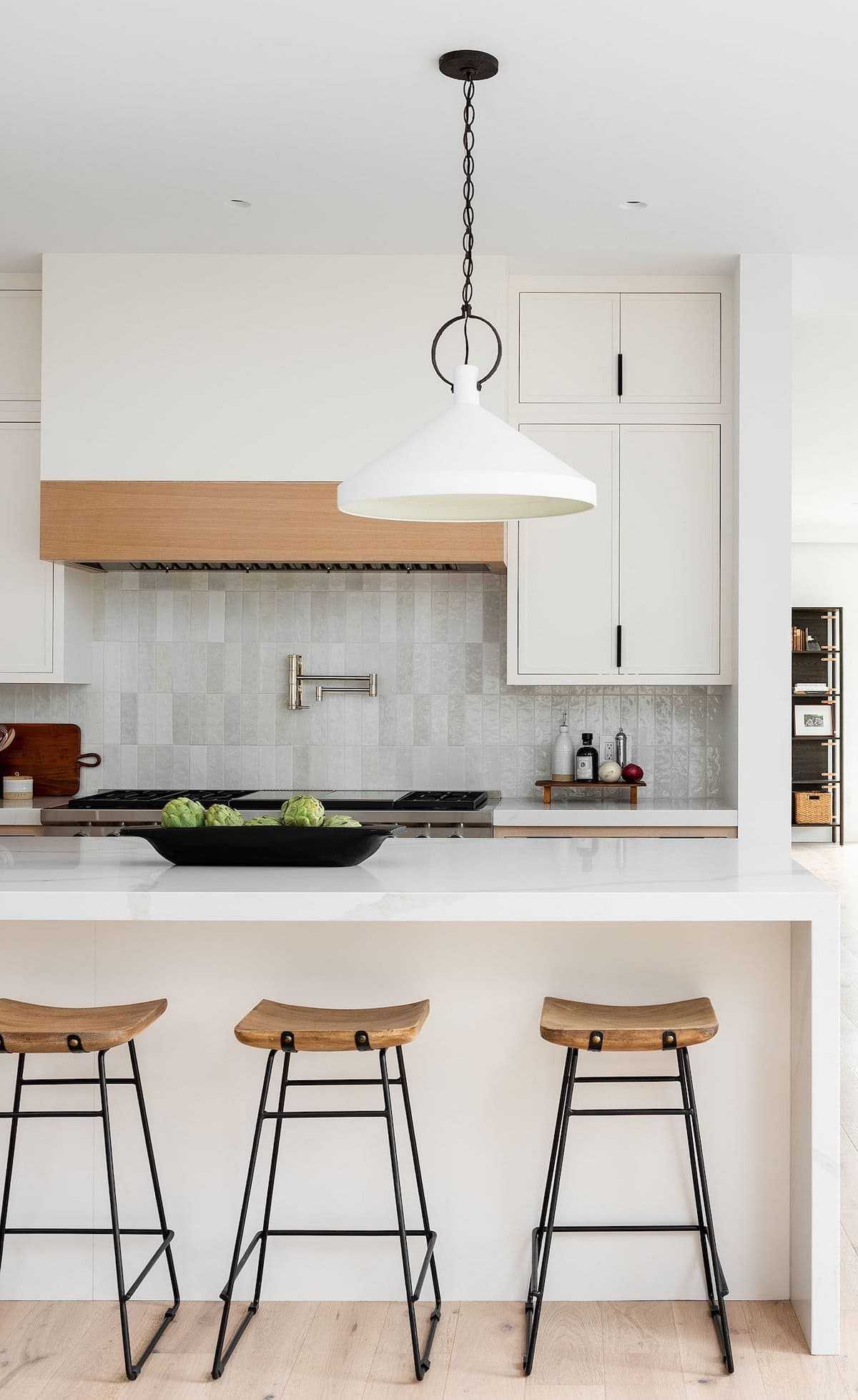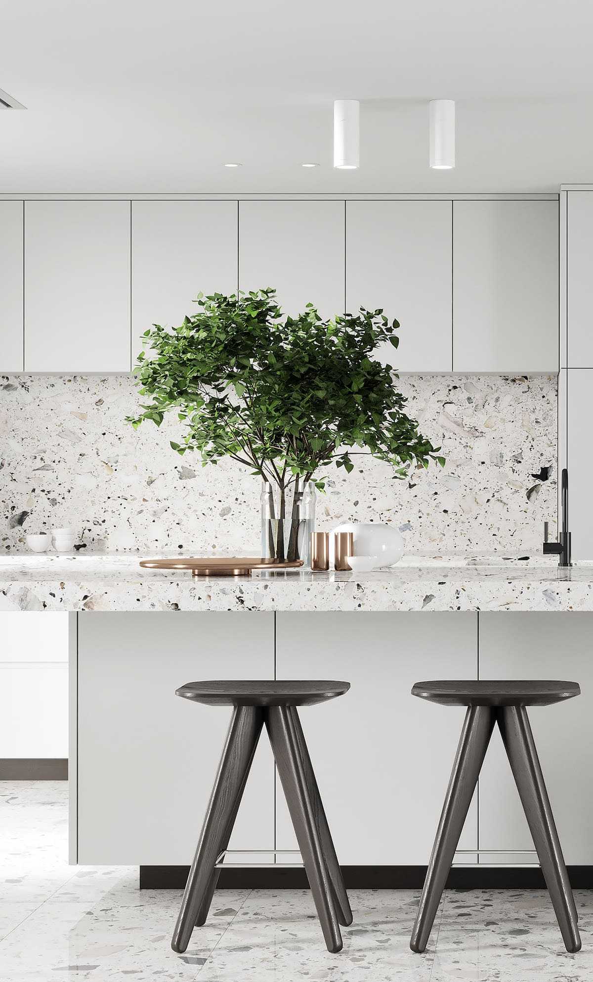 Современная фактурная плитка смотрится великолепно в интерьере белой кухни