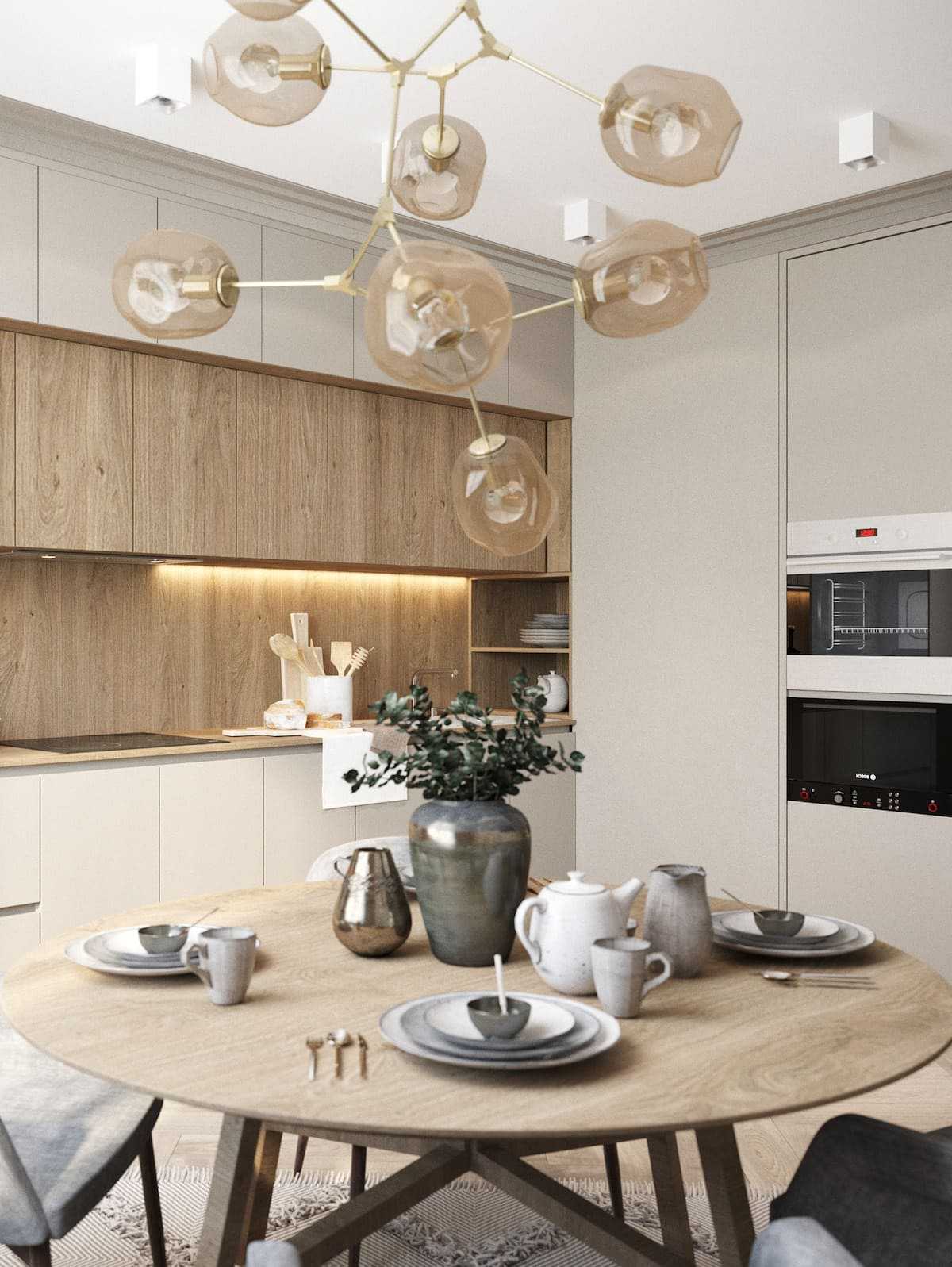 - Бежевый. Теплая гамма идеальна для комнат с северными окнами, в которых не хватает солнечного света. Бежевый чуть темнее белого, но все еще светлый: поэтому сохраняет все преимущества первого. Интерьер кухни в таком цветовом решении выглядит очень уютно.