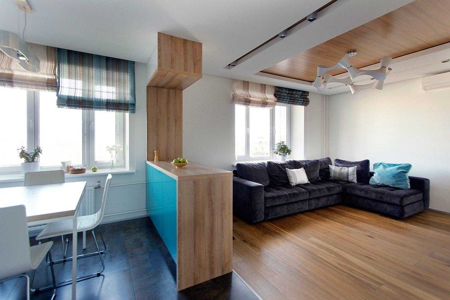 Если есть гостиная или столовая, объединенные с совмещенной кухней, для визуального разграничения пространства часто устанавливают перегородку между ними. Она препятствует распространению запахов, устраняет шум, но не делает пространство меньше. В качестве перегородки может служить стеклянная раздвижная конструкция, полки с цветами, книгами, декоративной посудой. Такая роль может быть отведена барной стойке, конструкциям из гипсокартона: колоннам, арке, фальш-стене с нишами, сквозным стеллажам.