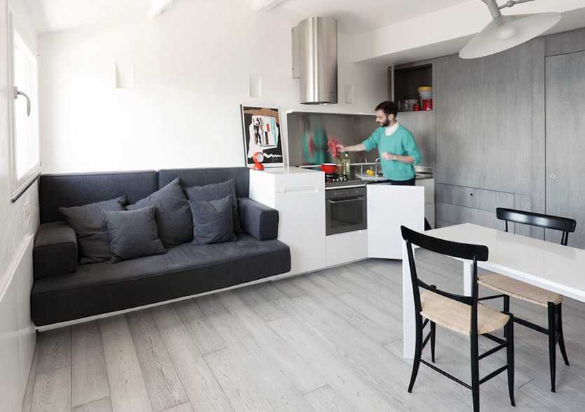Часто хозяева квартир объединяют жилую зону с кухонной в стремлении рационально использовать каждый квадратный сантиметр помещения.
