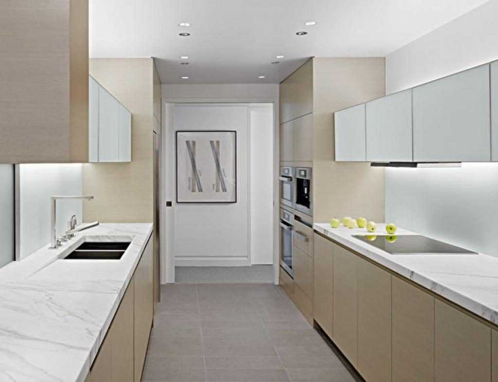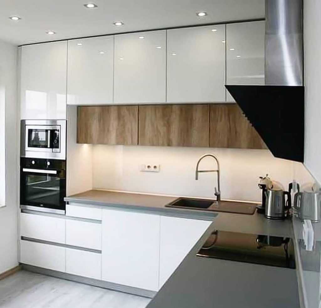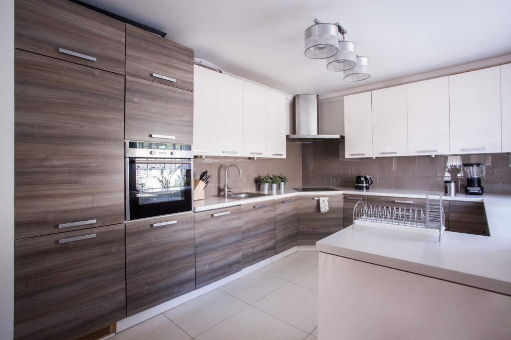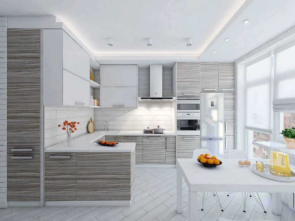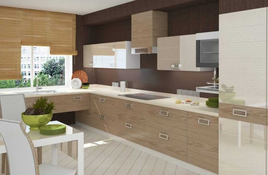 Дизайн кухни с белым верхом и светло-коричневым низом
