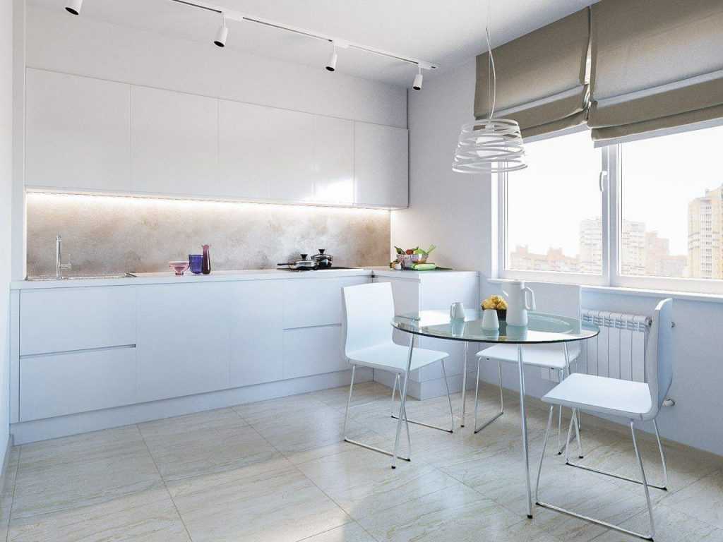 Для него характерны простота и практичность. С помощью светлых оттенков кухня получится не только современной, но и визуально просторнее. Кухонный гарнитур должен быть сдержанным, без вензелей и резных фасадов. Встроенная бытовая техника будет отличным решением. В качестве занавесок для окон стоит использовать жалюзи или римские шторы.