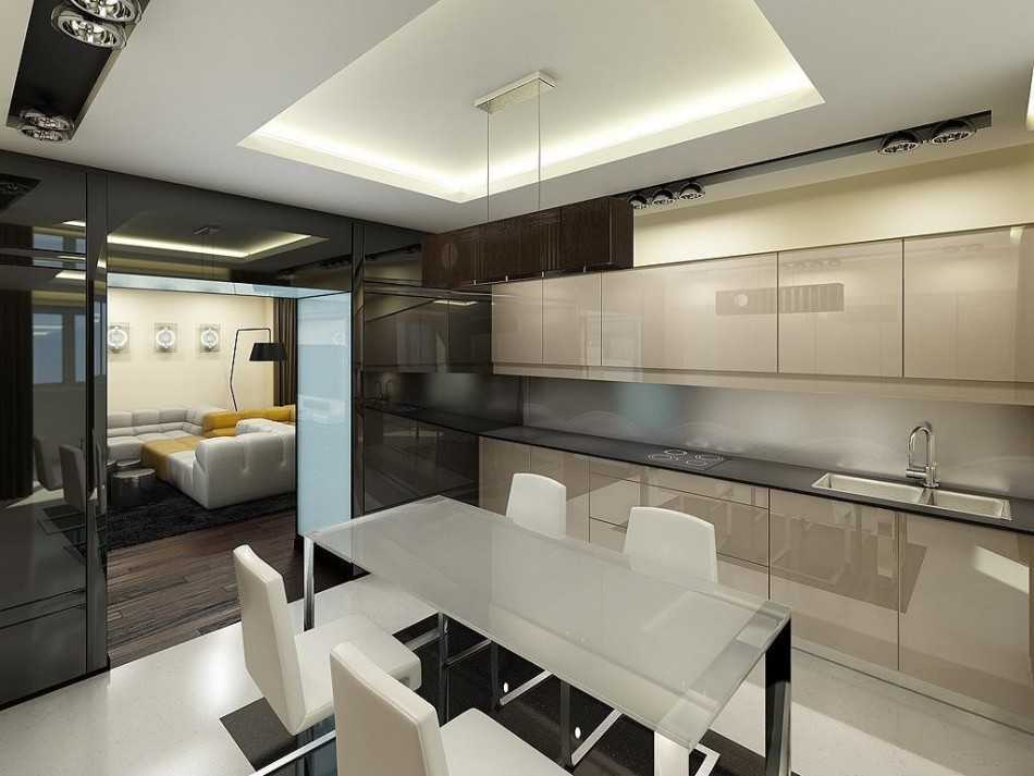 Потолок должен быть светлым, лучше матовым, но уместен и глянец. Он может быть покрыт штукатуркой или краской, оптимален натяжной потолок, а если высота позволяет, то кухню-гостиную лучше разграничить гипсокартонным двухуровневым потолком. Ниже — фото (листайте вправо).
