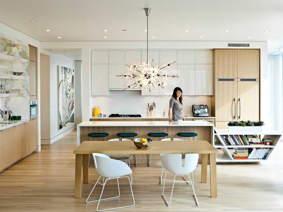 В минималистичный интерьер прекрасно вписываются светильники простых геометрических форм. Организуйте центральное освещение при помощи крупной потолочной люстры или нескольких небольших светильников над обеденным столом.