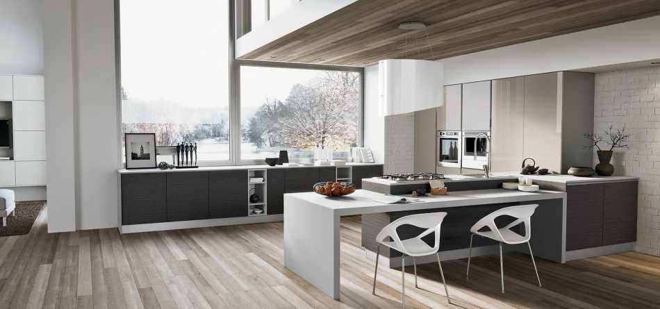 Основное правило – простота и функциональность. Строгий дизайн и безупречная гладкость фасадов скрывает наличие умной фурнитуры, продуманную систему хранения и четкую организацию шкафов. Гарнитур часто встроенный – шкафы и стены образуют единую плоскость, в которой также умещаются холодильник, варочная панель и посудомоечная машина. Подойдут и угловые варианты.