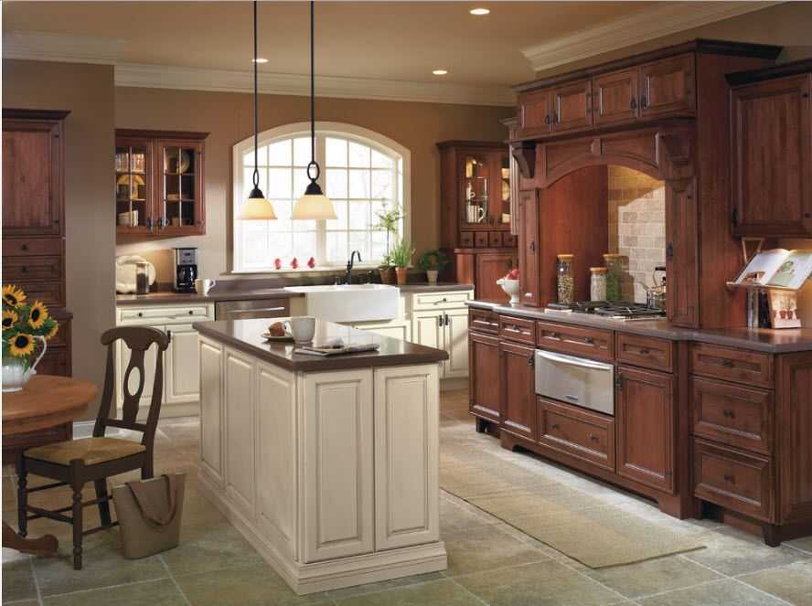 Цвет фасадов и столешниц необязательно должен быть однотонным. В одном гарнитуре может быть удачно подобран темный (орех или дуб) и светлый (сосна, бук) материал. Однако следует учесть, что чем светлее мебель, тем стертее грань между кантри и провансом. Эти кухонные стили имеют небольшие отличия, но все-таки очень пересекаются между собой.