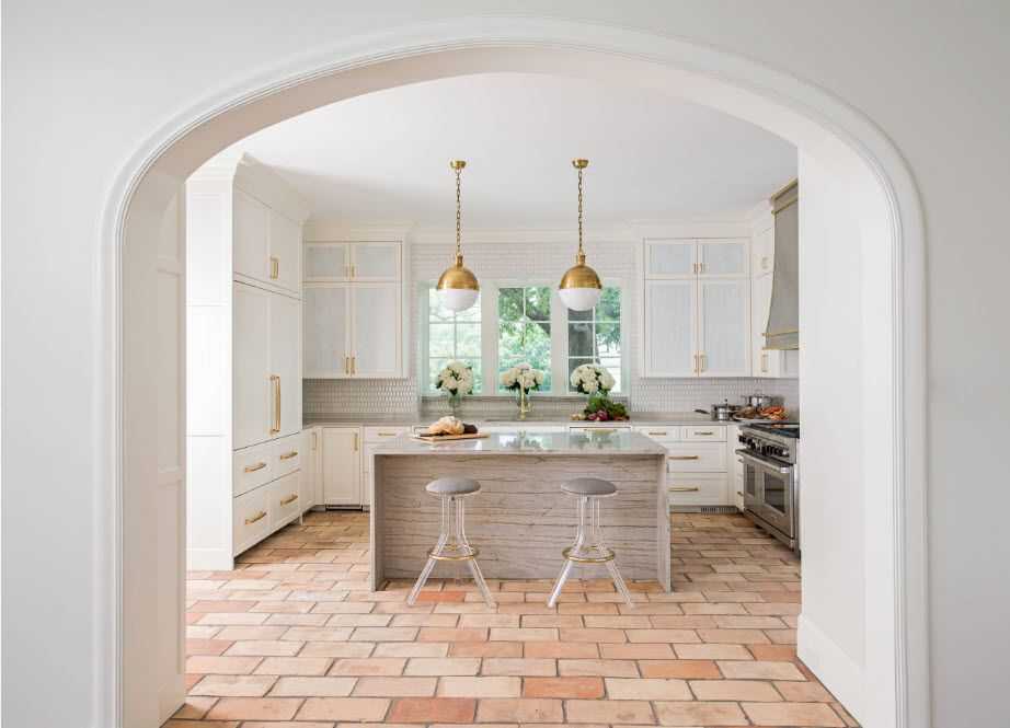 Практичный и объединяющий ход — выложить одинаковой плиткой фартук, плинтуса, торцы мебели и оконные откосы.