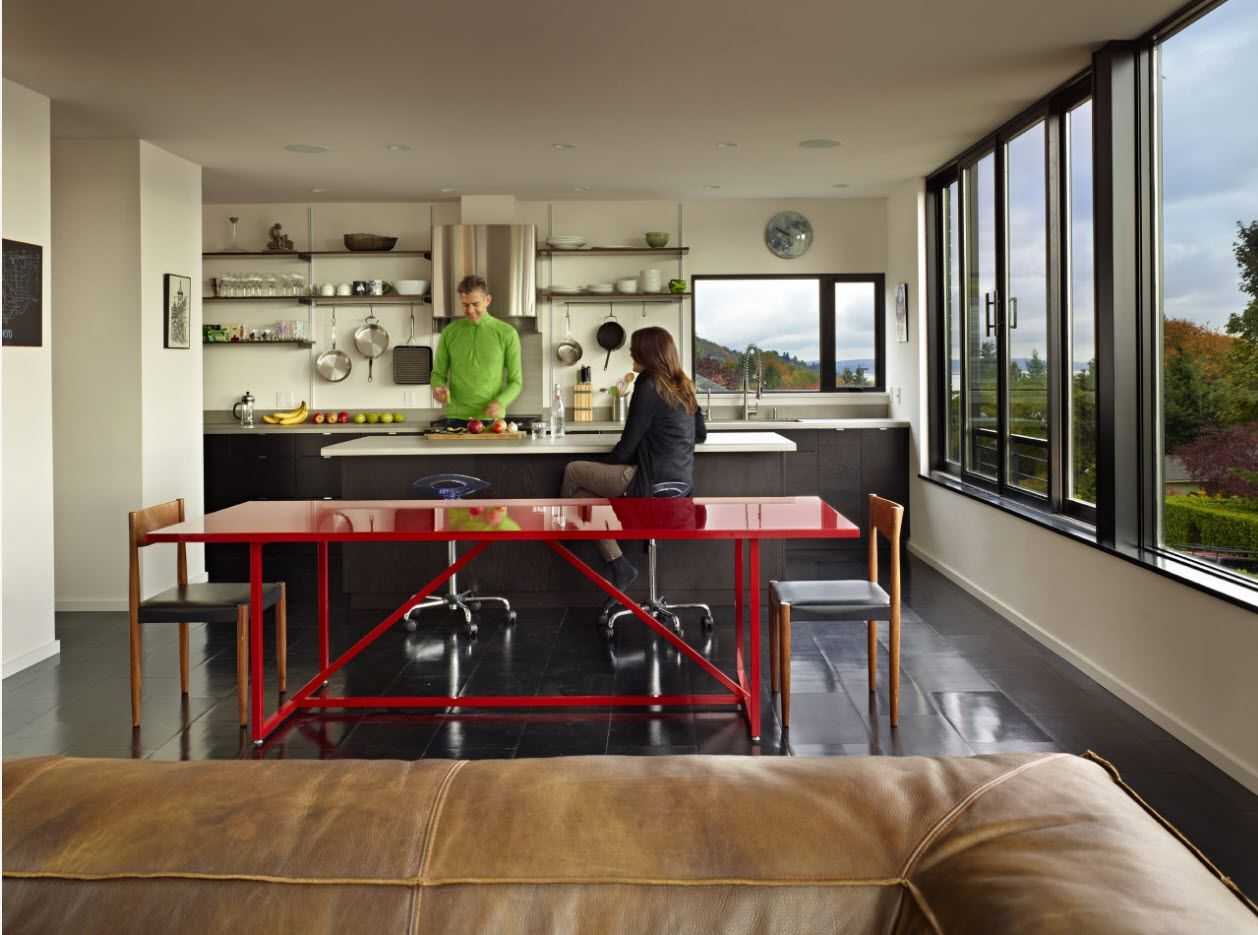 Вы не видите необходимости в просторном обеденном столе? Тогда перенесите столовую в зону отдыха, разместив у дивана небольшой стол, или сведите ее размеры к минимуму. К примеру, если снести стенку между гостиной и кухней наполовину, можно получить еще одну рабочую поверхность, мини-обеденную для 2-4 человек, а заодно и зонирующий элемент.
