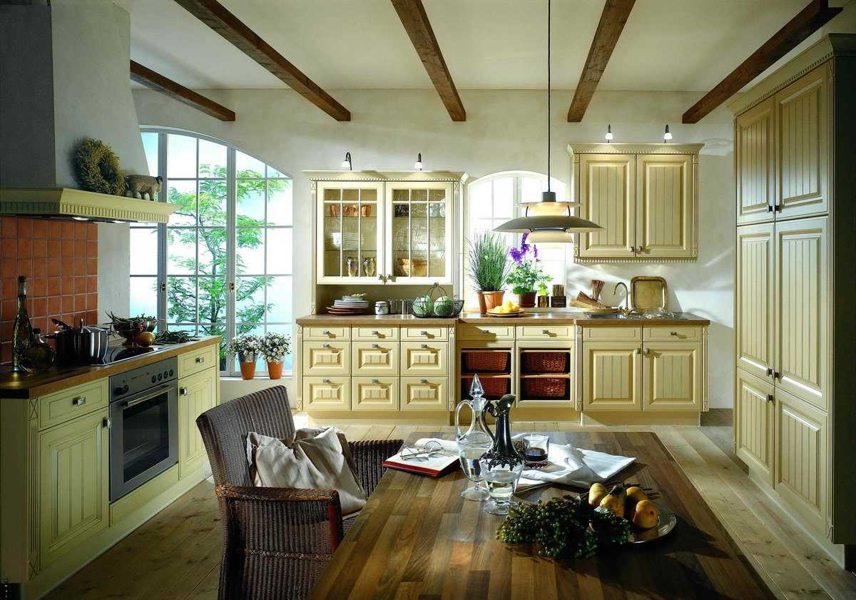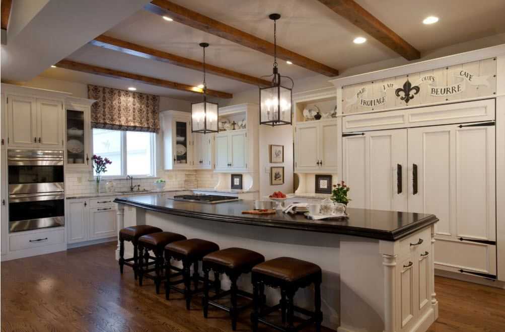 Потолки рекомендуется штукатурить и красить или белить. Также, для придания особого деревенского колорита, над головой под перекрытием дизайнеры нередко советуют устанавливать декоративные массивные балки из дерева. Однако подобный вариант подходит лишь для просторных кухонь. Маленькое помещение так перегружать не нужно.