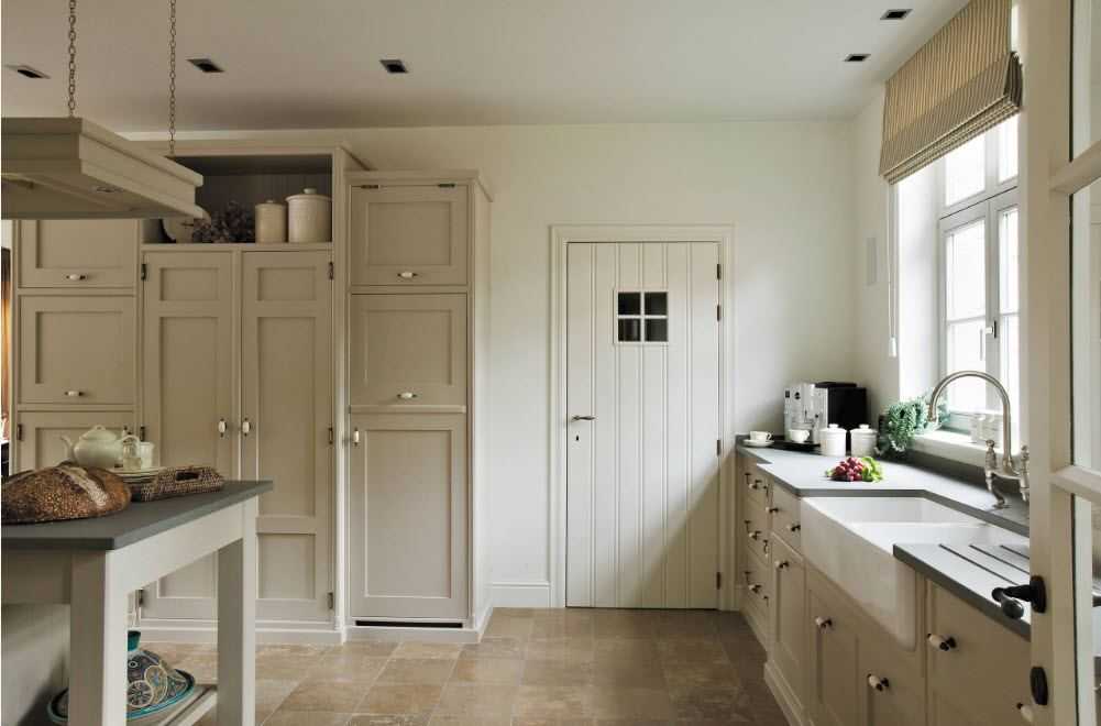 Окна в кухне прованс должны быть максимально большими, чтобы давать много солнечного света. При этом пластик лучше не использовать. Для средиземноморского дизайна больше подойдут деревянные либо «под дерево» рамы. Двери также следует выбирать из массива или со шпоном и окраской (лакировкой) в приглушенных тонах.