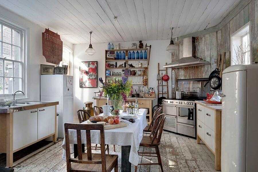 Мебель следует использовать в светлых тонах, но будет лучше, если кухонные столешницы останутся деревянными. Если у вас есть фарфор, который вы унаследовали от бабушки, не забудьте показать его. Благодаря этому, он станет не только полезным кухонным оборудованием, но и отличным украшением. Что еще нельзя пропустить: