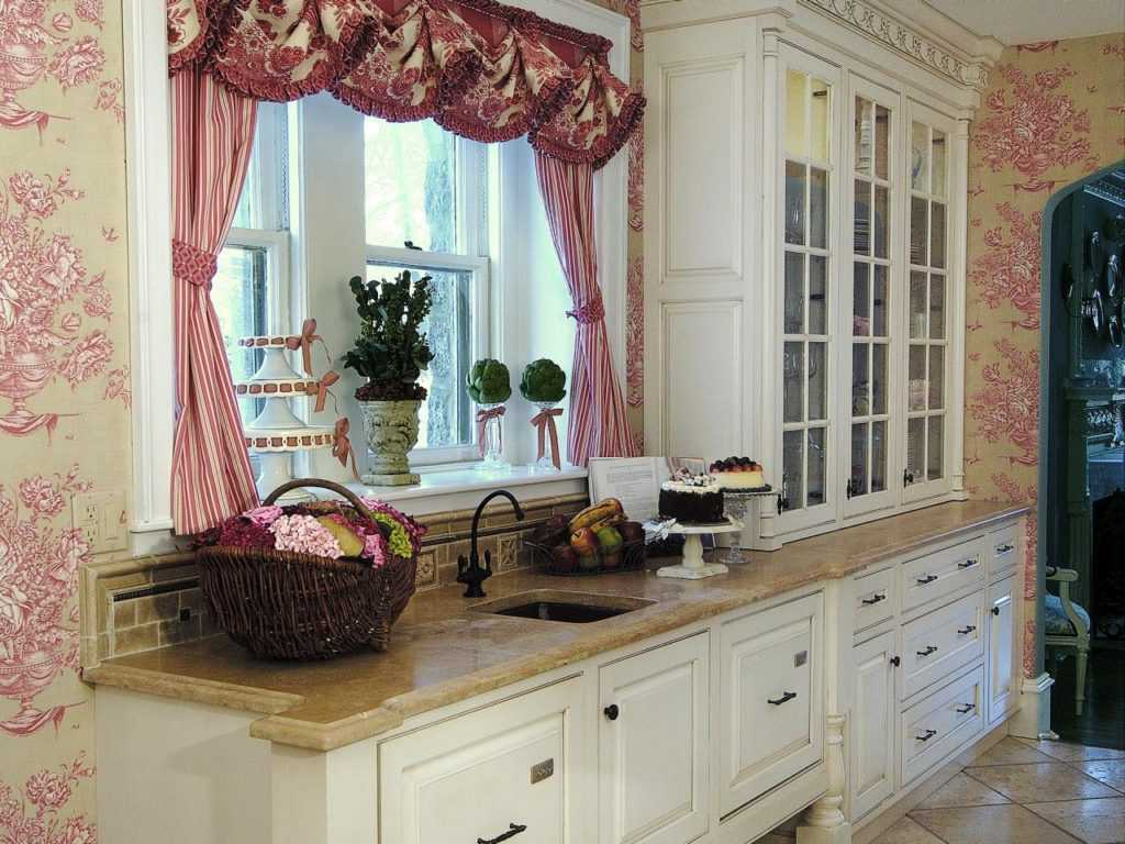 Классический вариант в интерьере кухни: розовая цветовая гамма, резные дверцы шкафов, обилие текстиля и винтажные сервизы. Даже современные бытовые приборы не выбиваются из общего стиля благодаря правильно подобранным цветам